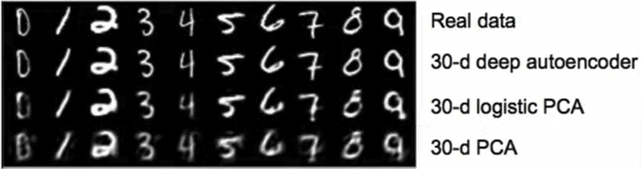 PCA又叫主成分分析法,是将n维特征映射到k维上,本质上是个线性变化。而AutoEncoder是基于DNN的,因为有激活函数,所以可以进行非线性变换。下图是MNIST数据集经过 PCA 和AutoEncoder 降维再还原后的效果。