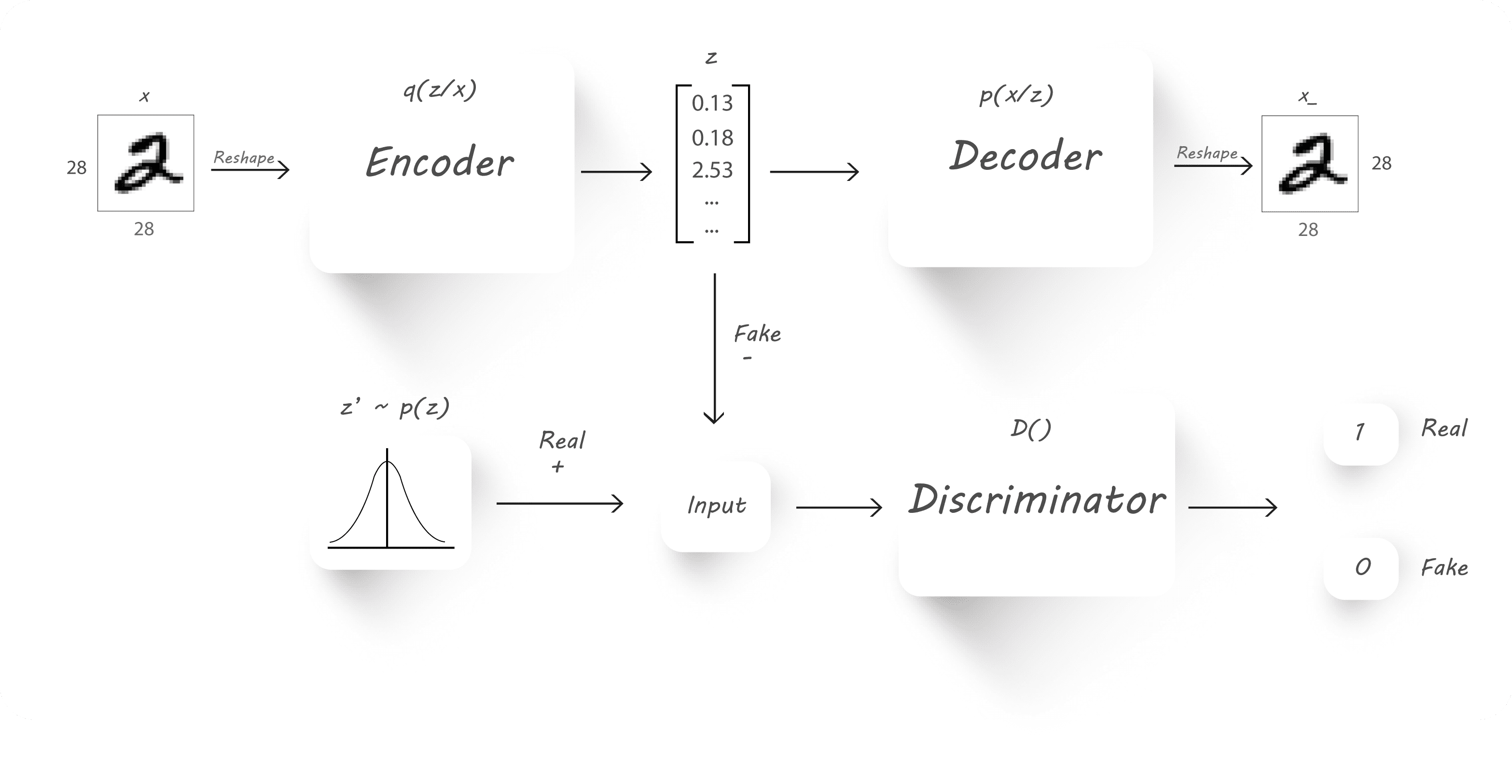 具体思路是这样的,我现在需要一个满足 p(z) 概率分布的 z 向量,但是 z 实际上满足 q(z) 分布。那么我就首先生成一个满足 p(z) 分布的 z′ 向量,打上 Real data 的标签,然后将 z 向量打上 Fake data 的标签,将它们俩送入判别器 D。判别器 D 通过不断学习,预测输入 input 是来自于 Real data(服从预定义的 p(z) 分布)还是 Fake data(服从 q(z) 分布)。由于这里的 p(z) 可以是我们定义的任何一个概率分布,因此整个对抗学习的过程实际上可以认为是通过调整 Encoder 不断让其产生数据的概率分布 q(z) 接近我们预定义的 p(z)。